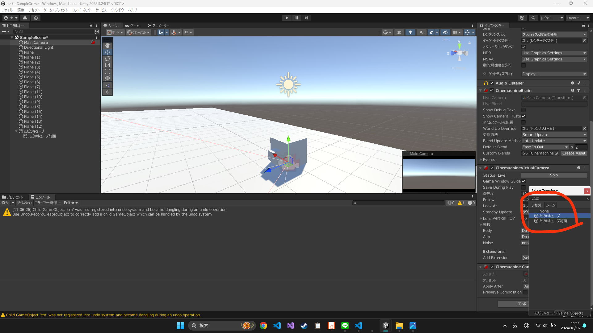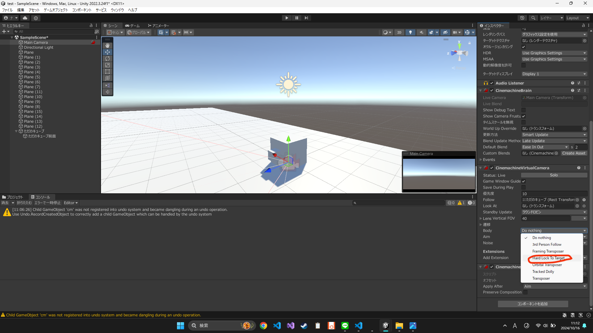 メインカメラを選択し、コンポーネント > Chinemachine > ChinemachineBrain