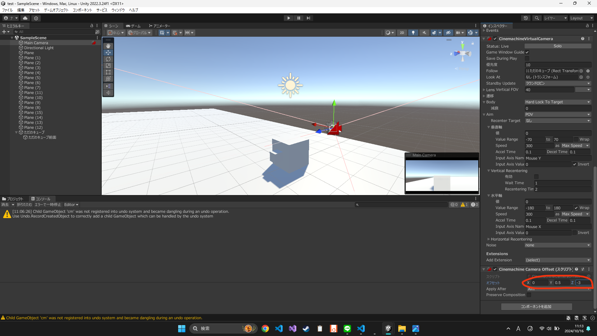 ChinemachineCameraOffsetのオフセットという項目で、キャラとカメラの距離感を設定できます