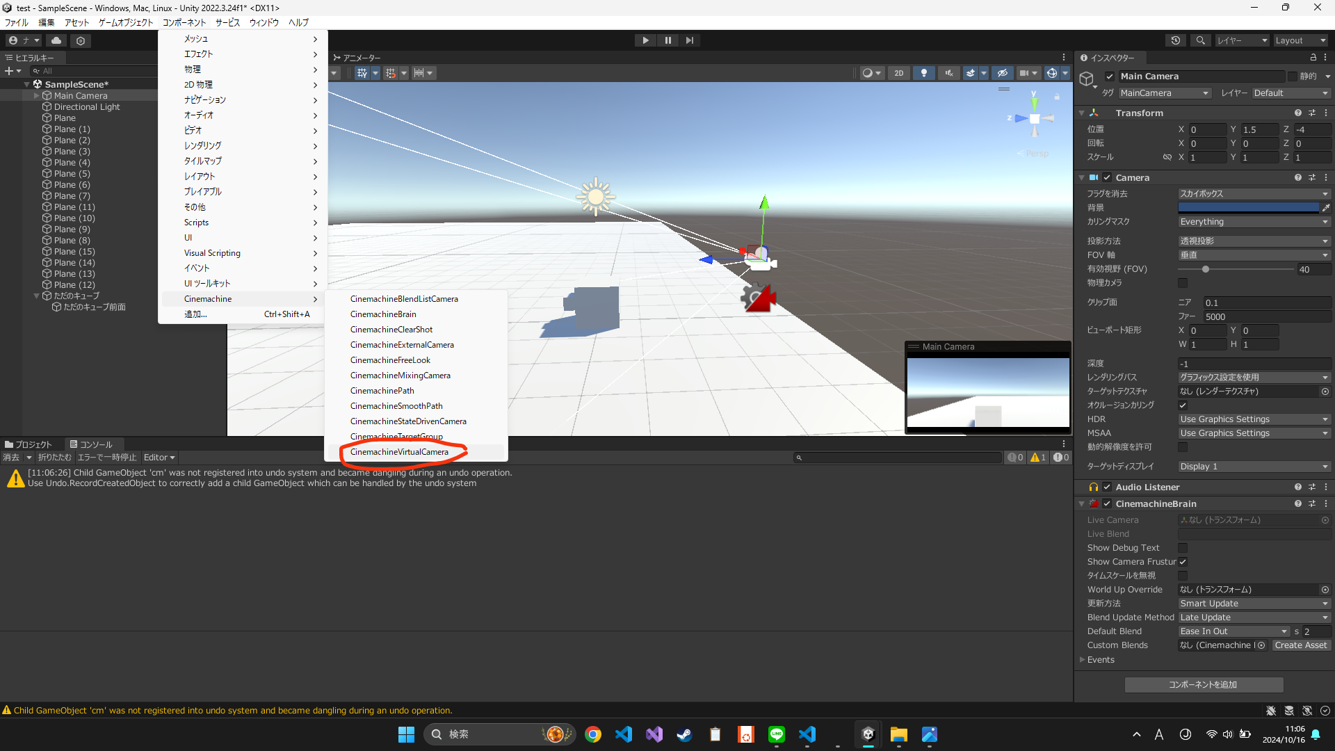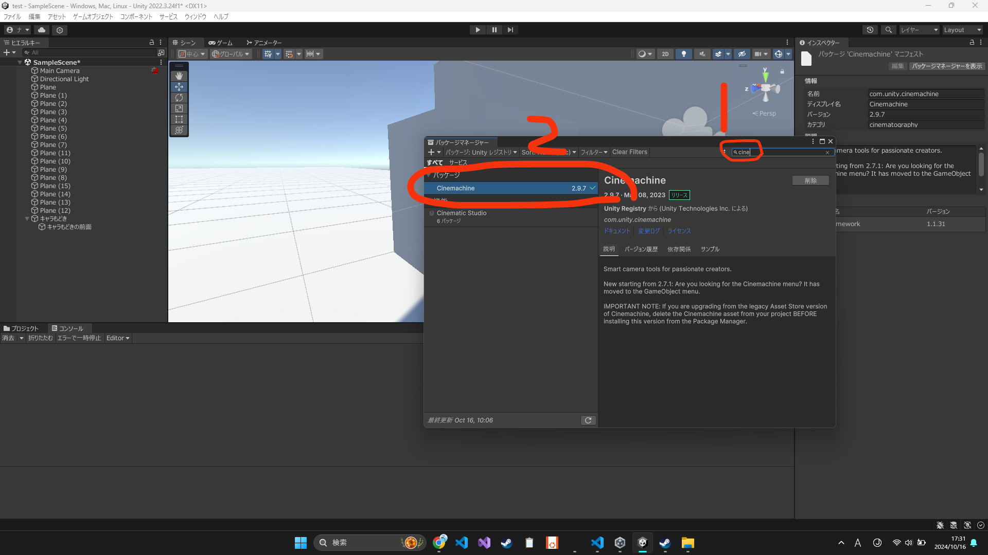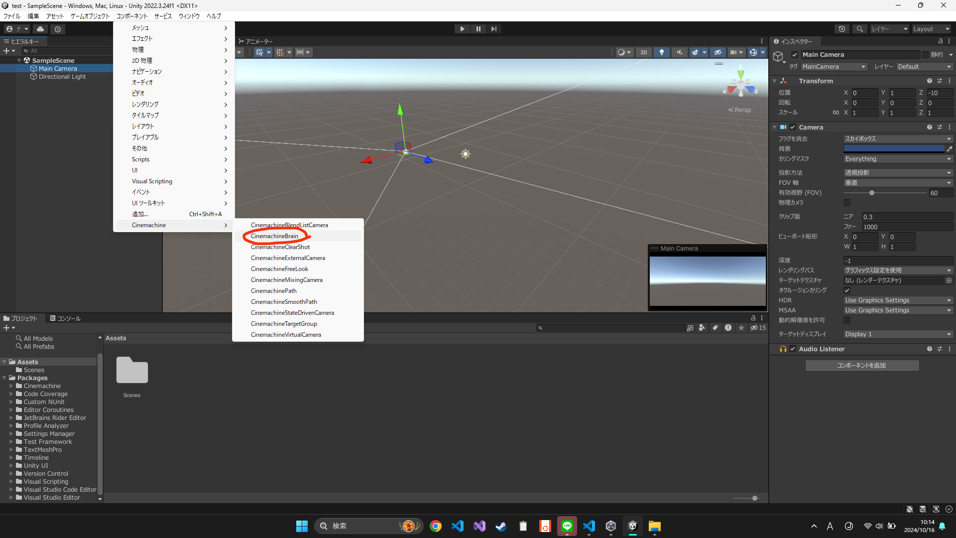 先ほどChinemaBrainを追加した要領で、ChinemachineVirtualCameraも追加しましょう