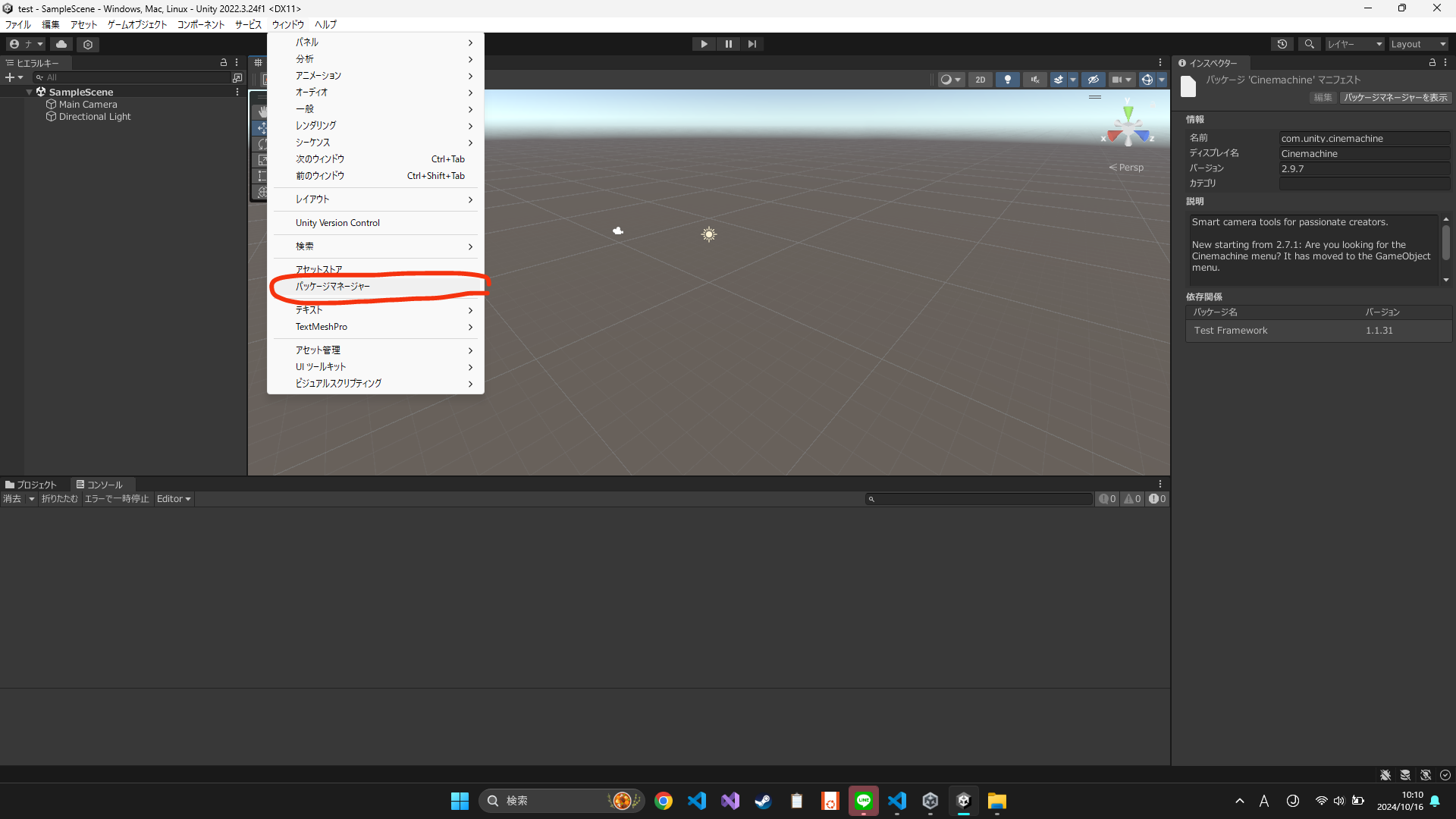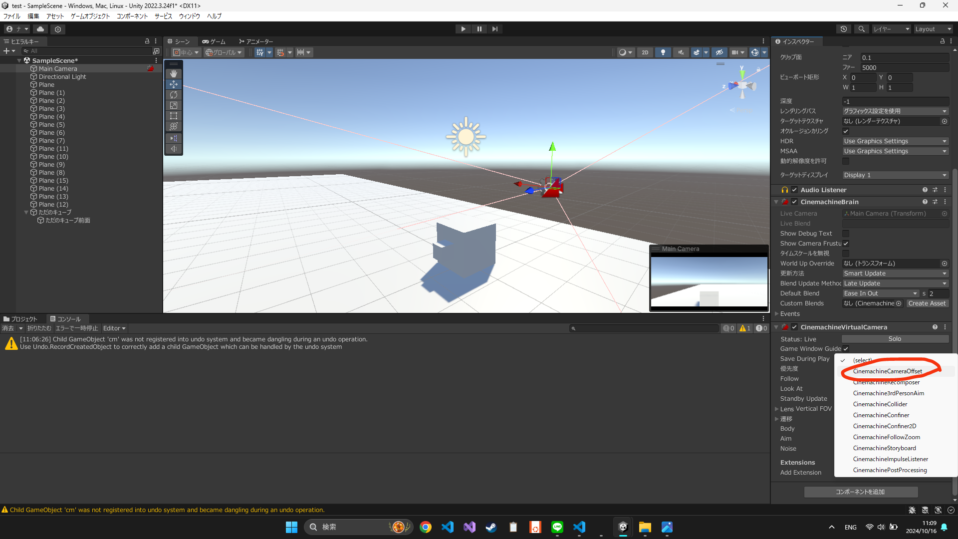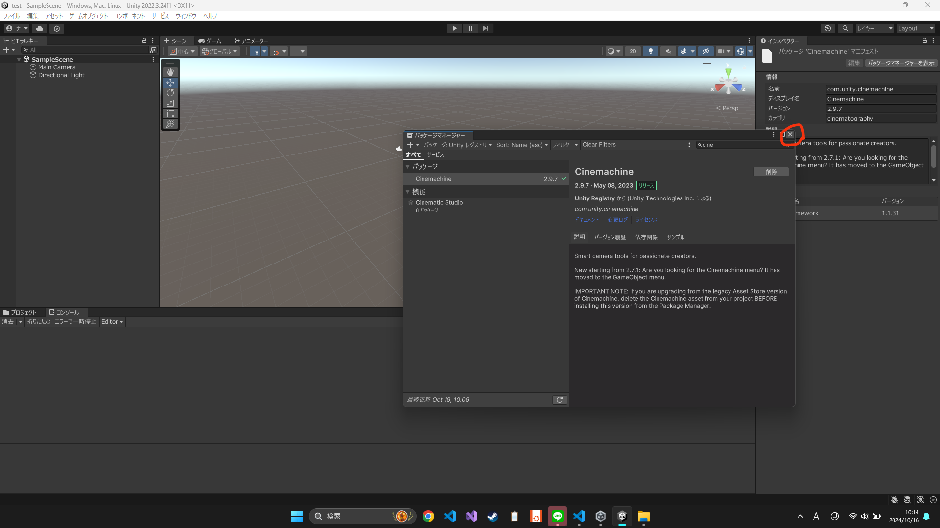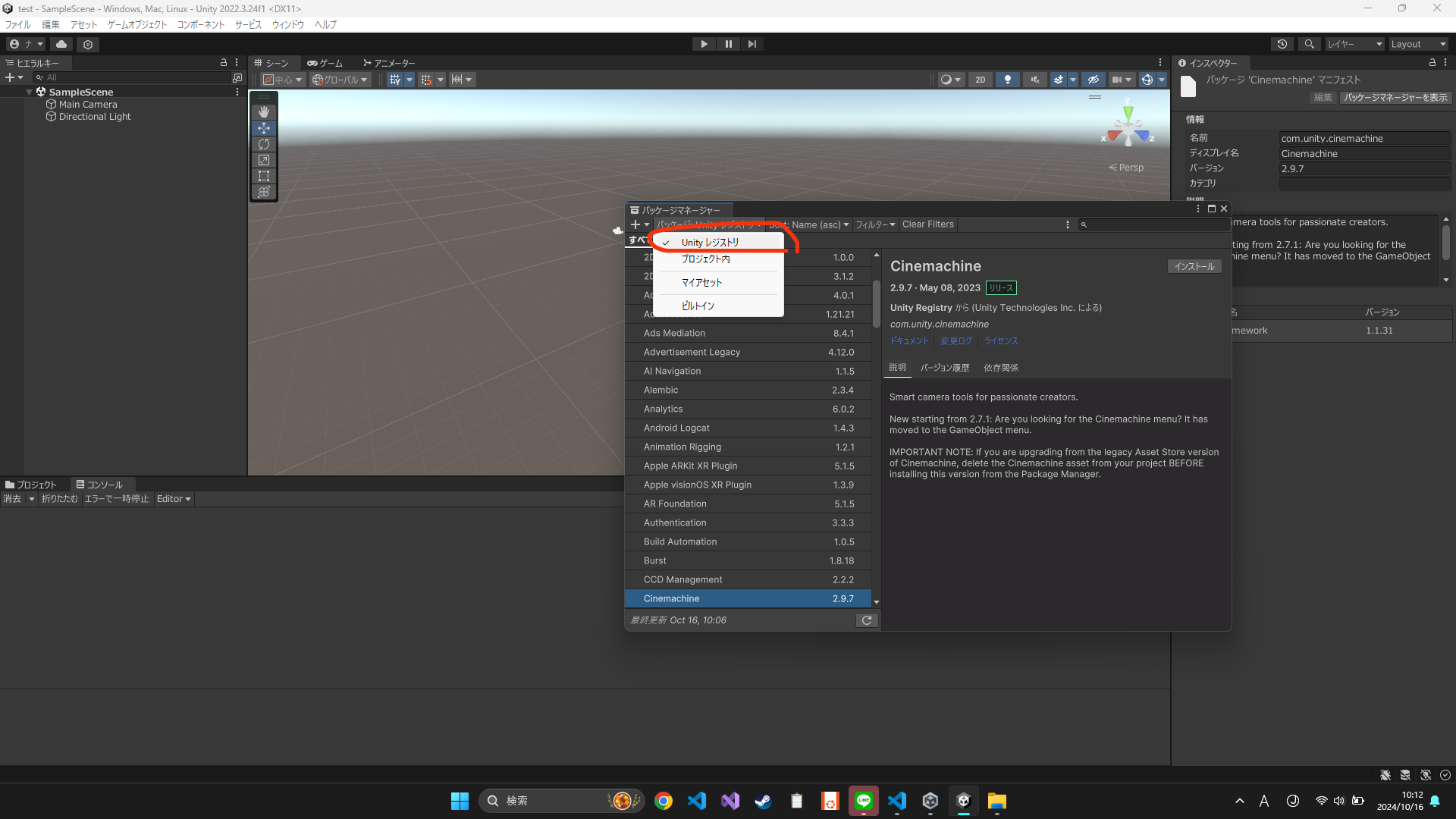 先ほどChinemaBrainを追加した要領で、ChinemachineVirtualCameraも追加しましょう